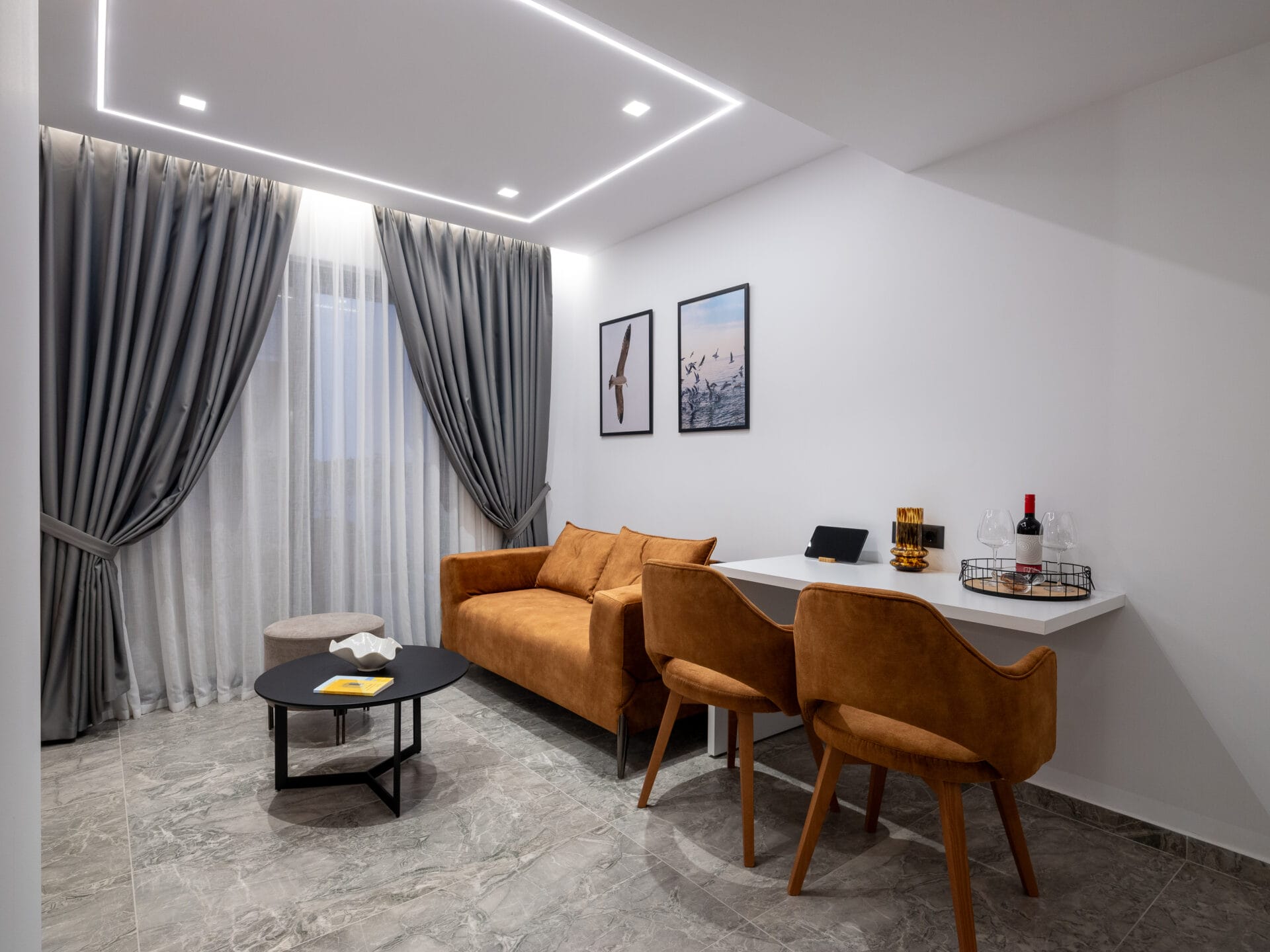 Embrace allure and comfort in the Sirens Suite, a Superior Quad maisonette of approximately 38 square meters, with 10 sq.m. balcony, thoughtfully designed for guests who seek both spaciousness and charm. Featuring a plush queen bed alongside a double futon, this suite effortlessly blends elegance with versatile living space, perfect for families or groups.